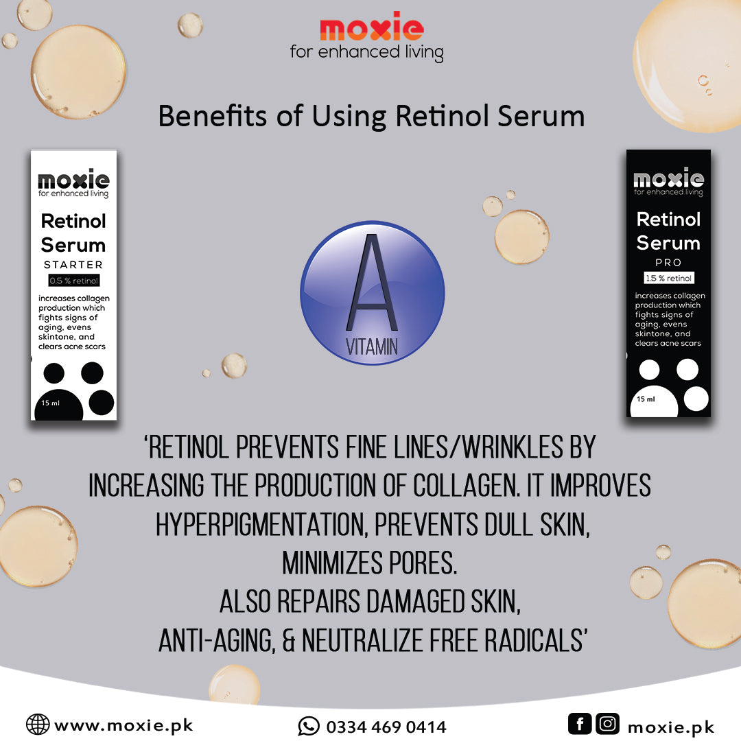 Moxie’s Retinol is the ultimate source of Vitamin A; with Niacinamide (Vitamin B3) and Hyaluronic Acid making it one of the most powerful Anti-Aging Serum available. An ultra light formula for all skin types.