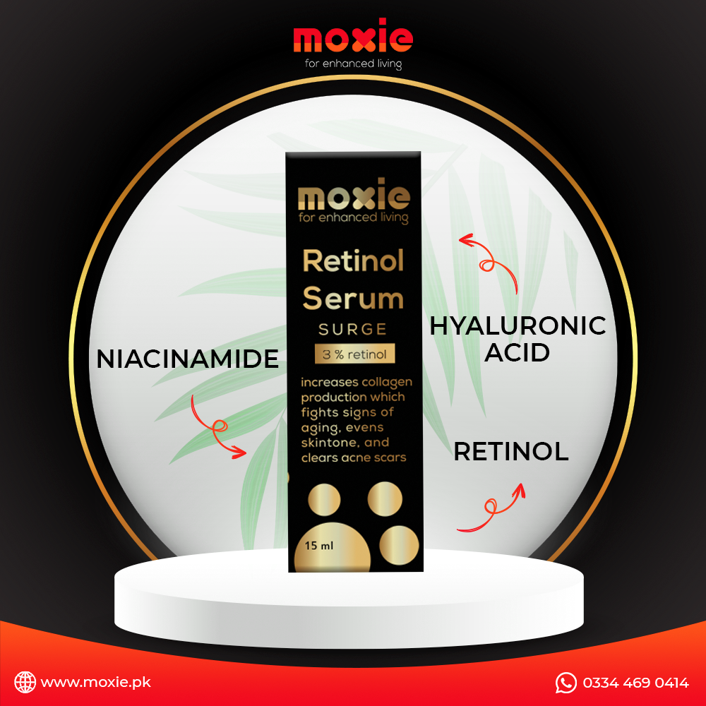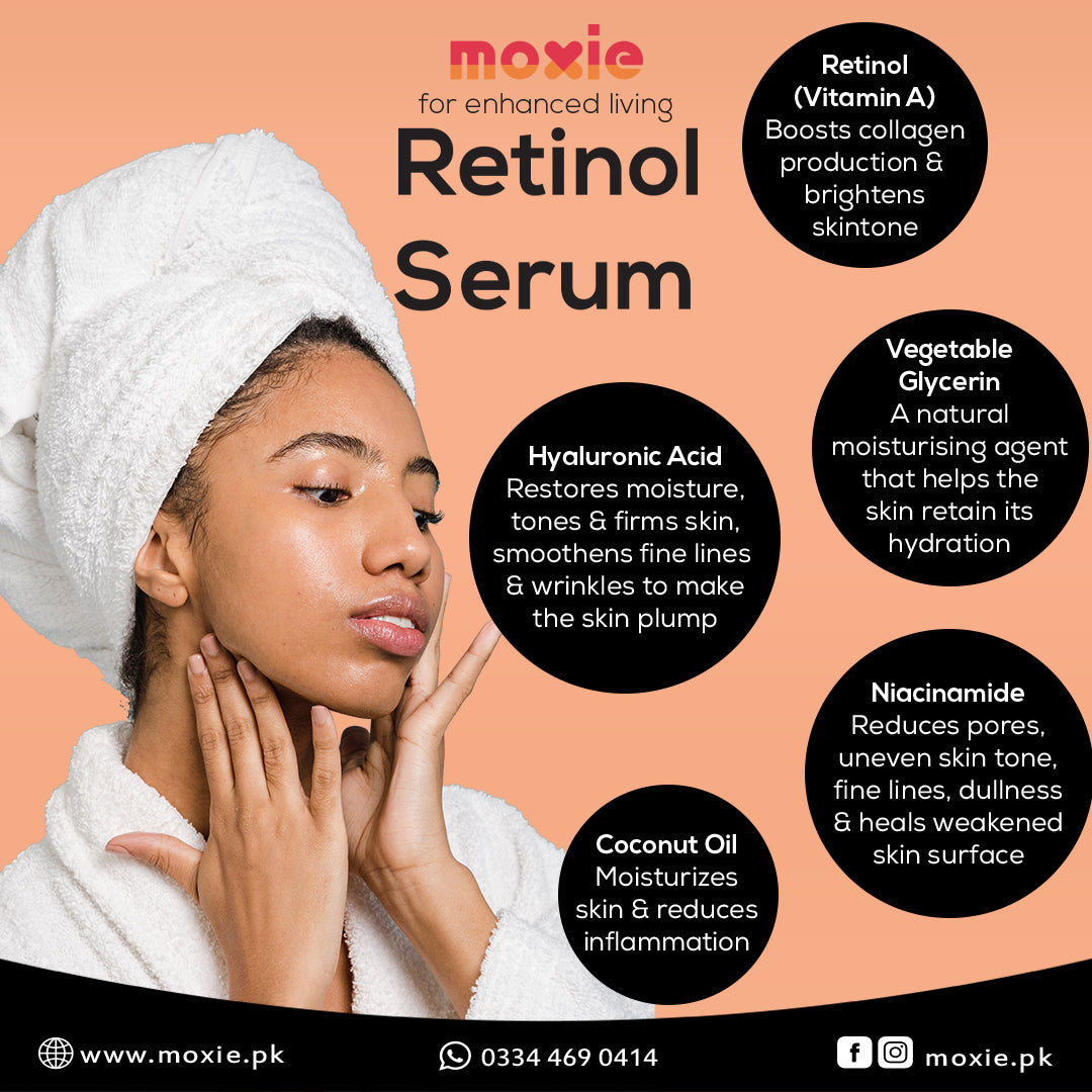 Moxie’s Retinol is the ultimate source of Vitamin A; with Niacinamide (Vitamin B3) and Hyaluronic Acid making it one of the most powerful Anti-Aging Serum available. An ultra light formula for all skin types.